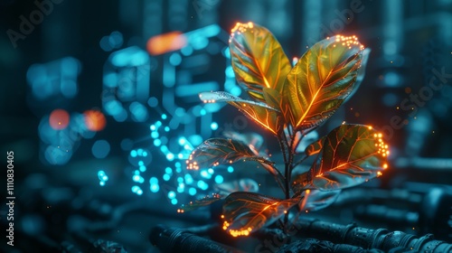 plant, futuristic, neural, root, glowing, high technology, laboratory, illuminated, leaf, nature, technology, innovation, science, biotechnology, hybrid, advanced, digital, vibrant, concept, light, organism, energy, system, integration, greenery, environment, modern, abstract, luminescence, research, eco, bright, bio