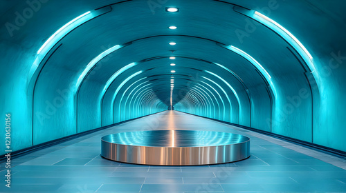 Futuristic Blue Illuminated Tunnel with Metal Platform