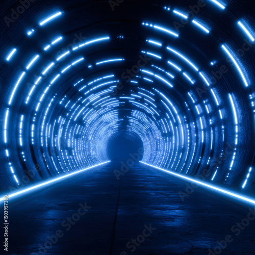 neon, light, tunnel, blue, futuristic, science fiction, technology, abstract, background, dark, glow, bright, illumination, energy, modern, design, pathway, corridor, space, cosmos, digital artwork, vibrant, electric, line, circle, pattern, texture, concrete, ground, floor