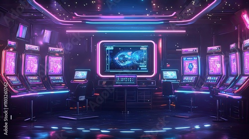 futuristic, casino, room, neon, light, slot, machine, purple, pink, blue, technology, screen, digital, gaming, gambling, interface, interior, design, modern, dark, night, glow, vibrant, colours, illuminated, sleek, stylish, sophisticated, elegant, computer, monitor, chair, table, floor, reflective, atmosphere, ambience, energy, excitement, game, play, succeed, lose, odd, chance, risk, reward