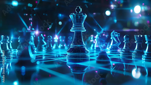 game, chess, futuristic, strategy, neon, blue, technology, digital, king, chessboard, piece, light, competition, board, abstract, pattern, victory, rook, concept, intelligence, success, modern, three-dimensional, network, play, background, knight, defeat, dark, move, power, design, art, bishop, glowing, business, pawn, checkmate, innovation, virtual, render, illustration, glow, cyber, queen, pink