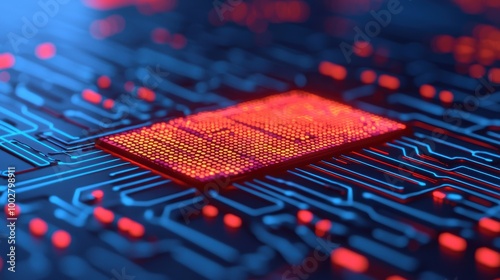 Futuristic Circuit Board with Bright Red Microchip