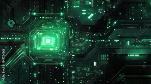 Futuristic Circuit Board with Glowing Paths in Green Color Scheme
