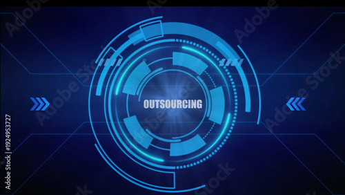 Futuristic circular interface with glowing blue lines and segments the word OUTSOURCING in the center against a dark blue digital background with