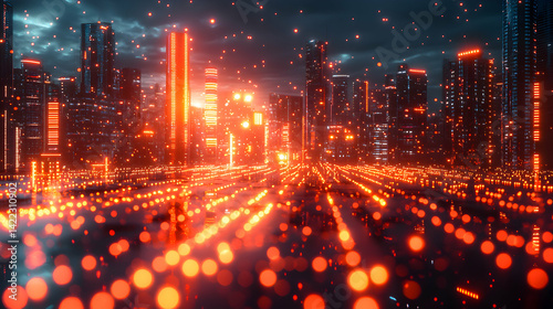city landscape, night, futuristic, glowing, light, urban, architecture, skyline, dark, red, orange, abstract, digital artwork, illustration, technology, science fiction, modern, metropolis, highrise, building, city lights, atmosphere, horizon, cloudy, night sky, vibrant, energetic, beautiful, dreamy, fantasy, imagination, creative, artwork, design, graphic, rendering, three-dimensional, simulation, pixel, pattern, perspective, background, wallpaper, concept, stream, streamline