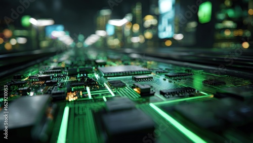 city, night, circuit, board, technology, green, light, future, urban, high technology, digital, innovation, abstract, glow, electronic, modern, pattern, line, component, chips, detail, closeup, perspective, sharpened, blur, movement, street, building, structure, dark, bright, neon, complex, system, datum, flow, network, progress, engineered, futuristic, interface