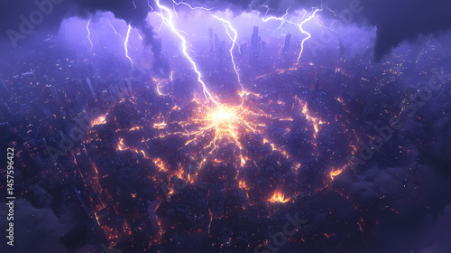 Futuristic city ravaged by lightning storm; aerial view showing destruction and energy. [Graviton Cities] | Aerial Dystopia | airborne slum. Illustration