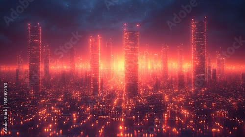 city landscape, building, city, urban, futuristic, architecture, sky, red, orange, light, illumination, tower, graphic, digital, illustration, design, artwork, image, graphic design, modern, technology, art, digital artwork, creative, abstract, background, colours, vertical, illuminated, sunset, dawn, design element, concept, contemporary, exterior, copy space, vector, night, building, industry, web, energy, skyline, fire, industrial, sun