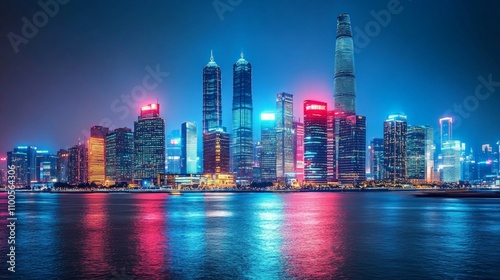 Futuristic City Skyline at Night, vibrant neon lights illuminating sleek architecture, showcasing a blend of innovation and modern urban life in a stunning nocturnal landscape