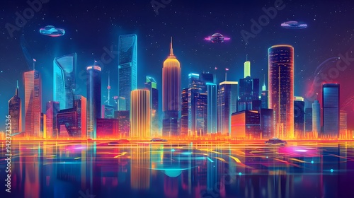 futuristic, city, skyline, night, glowing, building, flying, car, building, city landscape, urban, vector, sky, architecture, illustration, skyscraper, business, silhouette, town, moon, light, downtown, design, panorama, landscape, sunset, view, office, scene