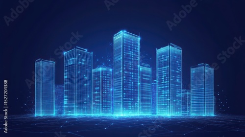 Futuristic city skyline, digital buildings, glowing lines, network connection, abstract cityscape.
