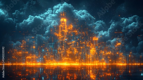 futuristic, city, skyline, cloud, computing, concept, cloud, night, light, technology, architecture, urban, building, skyscraper, illumination, glow, digital, infrastructure, smart, engineering, future, energy, power, abstract, design, innovation, datum, connectivity, visualisation, creativity, vision, construction, development, planning, progress, invention, transformation, metropolis, enterprise, network, automation, intelligence, efficiency, aglow, radiant, glowing, aethereal, dreamlike
