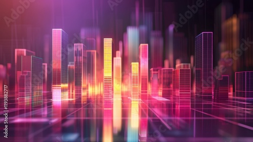 Futuristic city skyline with vibrant neon lights and reflections, showcasing digital landscape. colorful buildings create dynamic atmosphere of innovation and technology