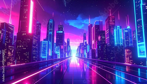 futuristic, city, neon, light, skyscraper, street, twilight, road, bright, colours, pink, blue, digital, art, graphic, urban, technology, shiny, modern, elevated, perspective, huge, empty, vibrant, geometric