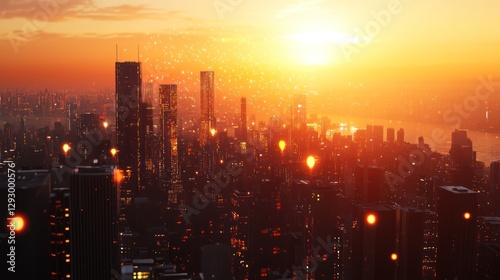 city, sunset, futuristic, light, urban, glowing, harbor, development, technology, city landscape, metropolis, building, skyline, modern, architecture, night, evening, urbanism, future, innovation, progress, growth, digital, smart, network, connection, global, earth, scene, view, panorama, landscape, background, illustration, design, graphic, image, photo, picture, art, abstract, concept, element, texture