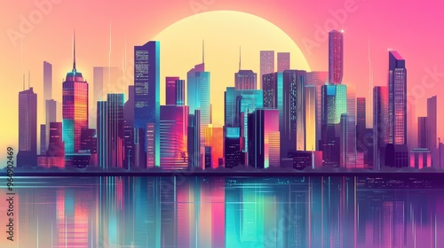 Futuristic city with colorful retro skyscrapers by a river, detailed in a cyberpunk style and set against a dynamic vector background
