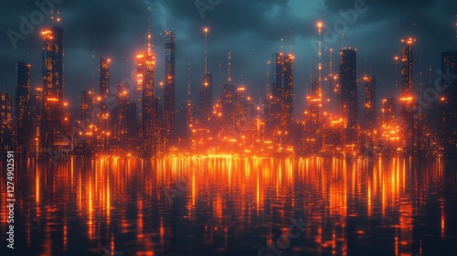 city landscape, futuristic, night, neon, light, water, calm, skyscraper, building, urban, modern, dark, orange, glow, illuminated, technology, digital, art, graphic, design, abstract, scene, view, landscape, environment, atmospheric, spectacular, amazing, fantastic, fire, flames, bright, high-coloured, intense, energetic, dramatic, silhouette, still, serene, evening, sunrise, lake, nature, cloud, sky, sunset, city, sun