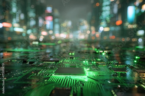Futuristic cityscape blurred in background, electronic circuit board in green, glowing