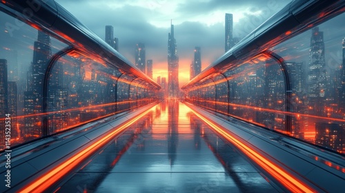 Futuristic cityscape, elevated walkway, glowing orange lights.