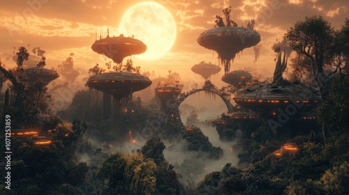 Futuristic Cityscape Floating Islands in a Mystical Forest at Sunset