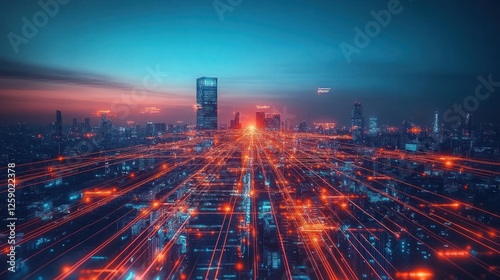 city, city landscape, futuristic, network, connection, connection, line, light, illuminated, sunset, sunrise, dusk, night, building, skyscraper, tower, technology, digital, datum, information, communication, orange, red, blue, teal, vibrant, glowing, bright, modern, urban, metropolis, scene, view, perspective, aerial, abstract, graphic, design, illustration, artwork, art