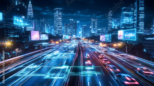 city, night, traffic, highway, road, car, light, futuristic, technology, digital, overlay, datum, network, connection, modern, urban, skyscraper, building, glow, bright, speed, motion blur, abstract, line, pattern, vibrant, blue, purple, pink, energy, innovation, progress, communication, future, city landscape, evening, darkness, illuminated, dynamic, fast, flow, movement, streak, electric, neon, graphic, design, illustration