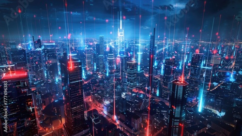 futuristic cityscape with a network of laser beams representing high-speed optical communication links connecting buildings
