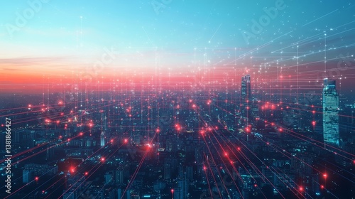 Futuristic cityscape with digital network connections at dusk