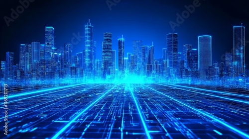 city landscape, futuristic, digital, technology, architecture, neon, blue, path, illustration, graphic, building, urban, light, design, abstract, line, modern, future, glowing, virtual, cyber, city, road, skyscraper, illuminated
