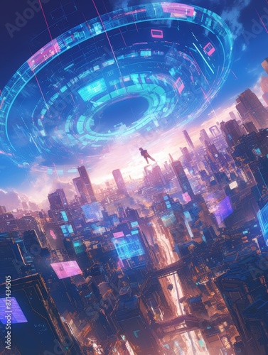 futuristic, city landscape, flying, science fiction, urban, technology, advanced, neon, digital, skyscraper, skyline, metropolis, innovation, virtual, modern, city, light, architecture, fantasy, future, night, glowing, vibrant, aerial, high technology, utopia, surreal, dreamlike, imaginative, holographic