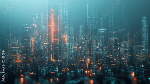 Futuristic cityscape with glowing skyscrapers and digital elements.