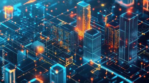 futuristic, city landscape, neon, light, wireframe, building, city, architecture, modern, abstract, digital, technology, glowing, bright, dark, blue, orange, line, grid, pattern, urban, design, style, illustration, concept, graphic, three-dimensional, render, night, scene, vibrant, illuminated, network, connection, virtual, reality, simulation, datum, structure, space, perspective, angle, view, detail, closeup, art, background