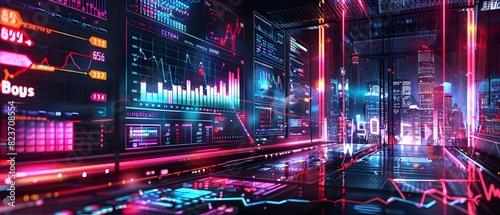 Futuristic Cityscape with Neon Lights Digital Data and Financial Analytics