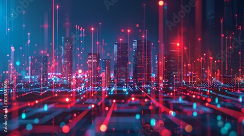 city, futuristic, network, connection, digital, illustration, skyscraper, building, line, dot, glow, light, red, blue, night, technology, urban, modern, abstract, graphic, design, architecture, cyber, datum, communication, cyberspace, wireframe, virtual, reality, future, progress, innovation, development, growth, interaction, global, earth, connectivity