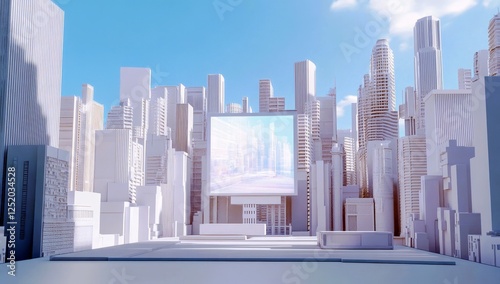Futuristic Cityscape with Tall Buildings and Large Display Screen in Bright Sky