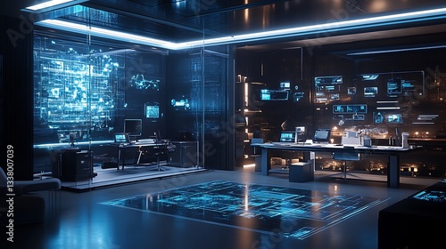Futuristic Command Center with Glowing Screens and Data Visualization