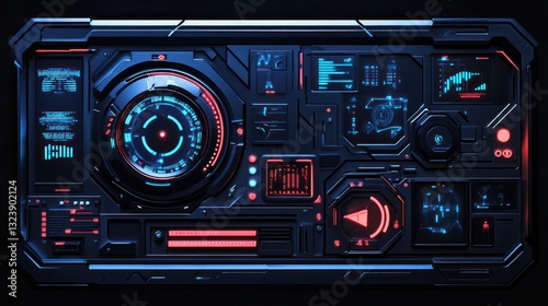 futuristic, control panel, science fiction, technology, interface, digital, display, screen, dashboard, neon, light, glowing, dark, black, red, blue, buttons, dial, meter, graphic, datum, information, system, control, monitoring, spaceship, aircraft, vehicle, cockpit, computer, contraption, device, machinery, illustration, abstract, background, texture, design, modern, innovative, advanced, high