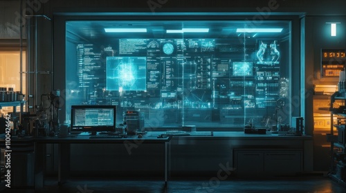 Futuristic Control Room with Tech Consoles and Neon Blue Displays at Night