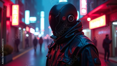 futuristic, street, city, neon, light, helmet, jacket, figure, mystery, urban, night, dark, technology, artificial intelligence, ai, robot, android, science fiction, science fiction, alley, people, walking, red, blue, glow, mask, anonymous, leather, clothing, style, design, art, illustration