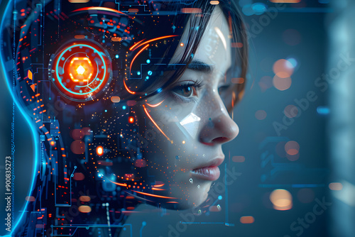 futuristic cyborg girl, artificial intelligence concept, electronic brain interface, cybernetic robot, sci-fi aesthetic, advanced machine learning technology, immersive digital landscape
