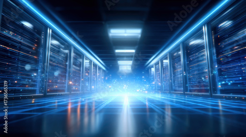 Futuristic data center corridor with illuminated server racks and glowing blue lights creates high tech atmosphere. sleek design emphasizes advanced technology and digital connectivity