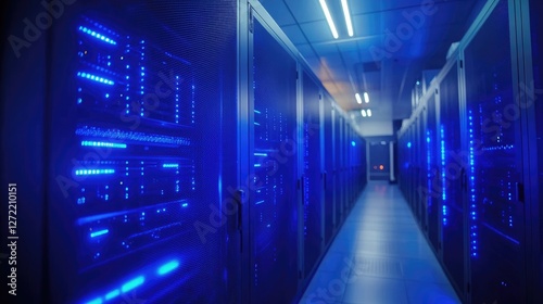 Futuristic data center with illuminated server racks and advanced networking. Ideal for cloud computing, cybersecurity, and IT infrastructure concepts