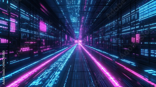 datum, tunnel, neon, code, futuristic, technology, digital, virtual, server, matrix, glowing, light, speed, fast, motion, graphic, design, abstract, architecture, hallway, corridor, information, binary, programming, system, network, cyber, computer, innovation, future, advancement, visualisation, rendering, three-dimensional, illustration, colours, magenta, blue, pink, violet, dark, energy, powerful