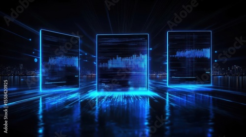 Futuristic Data Visualization with Blue Neon Panels and Cityscape Background
