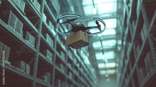 Futuristic delivery drone flying over shelves in a warehouse, transporting a brown package, emphasizing autonomous technology