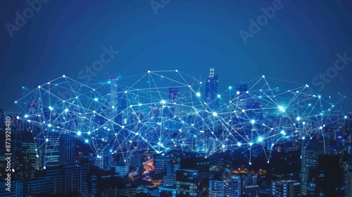 Futuristic digital cityscape with global connectivity and network integration - abstract graphic depicting 5g technology, smart wireless systems, and social media networking for modern business soluti