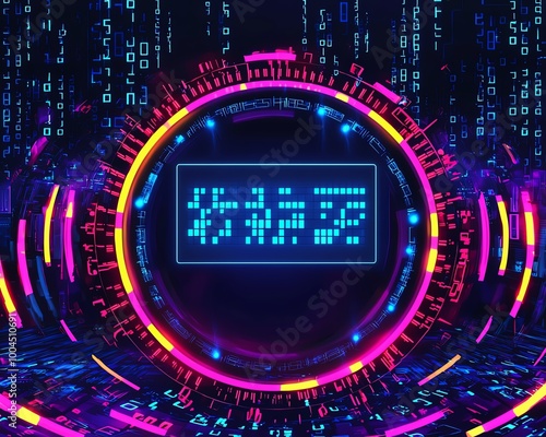 Futuristic digital countdown clock card with a blank screen in the center for messages, surrounded by neon lights and binary code patterns