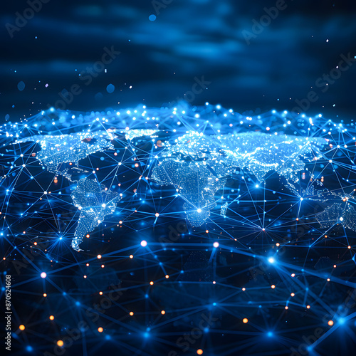 Futuristic digital global network map. Illuminated web of connections and data points representing world connectivity and big data.