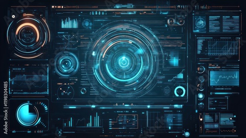 technology, interface, digital, futuristic, screen, datum, information, display, dashboard, monitor, graphic, chart, graph, network, system, computer, science, innovation, design, modern, abstract, background, pattern, light, blue, dark, glow, bright, circle, line, shape, element, visual, concept, illustration, template, web, software, application, future, progress, development, research