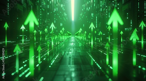 Futuristic digital landscape with glowing green arrows pointing upward, symbolizing growth and progress in technology. scene is immersive and vibrant, evoking sense of advancement